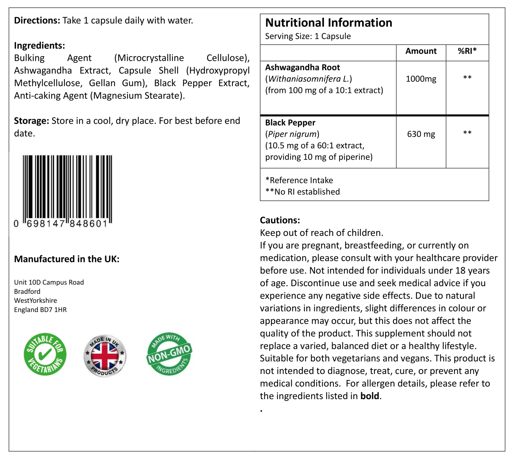 Ashwagandha Extract, Capsule Shell (Hydroxypropyl Methylcellulose, Gellan Gum), Black Pepper Extract,